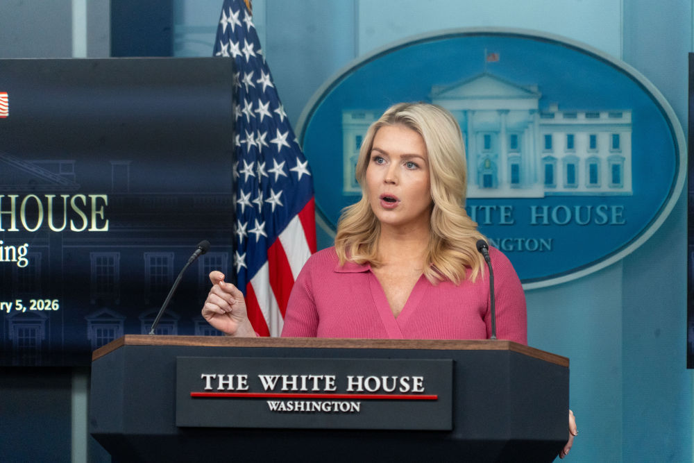 2月5日,在美国首都华盛顿,白宫新闻秘书莱维特出席记者会。新华社发(李源清摄)